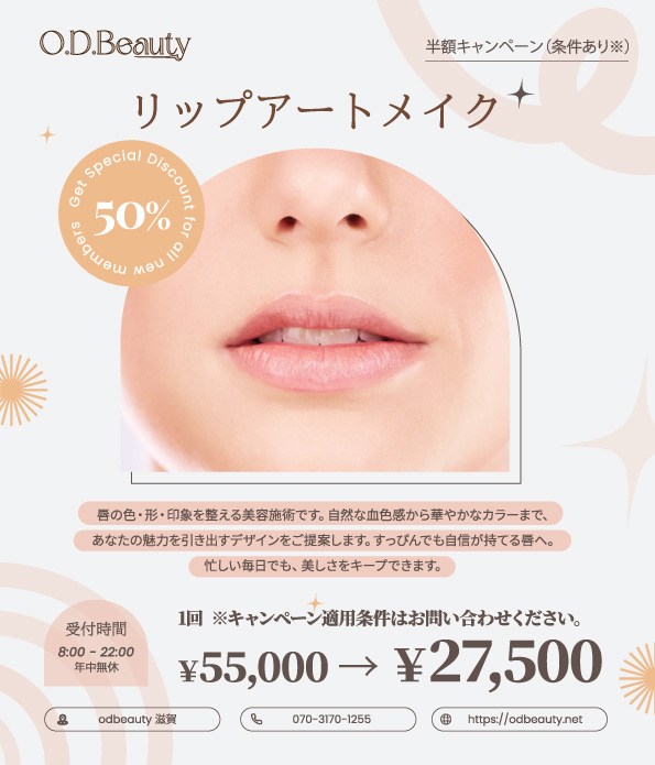 唇の色・形・印象を整える美容施術です。自然な血色感から華やかなカラーまで、あなたの魅力を引き出すデザインをご提案します。すっぴんでも自信が持てる唇へ。忙しい毎日でも、美しさをキープできます。